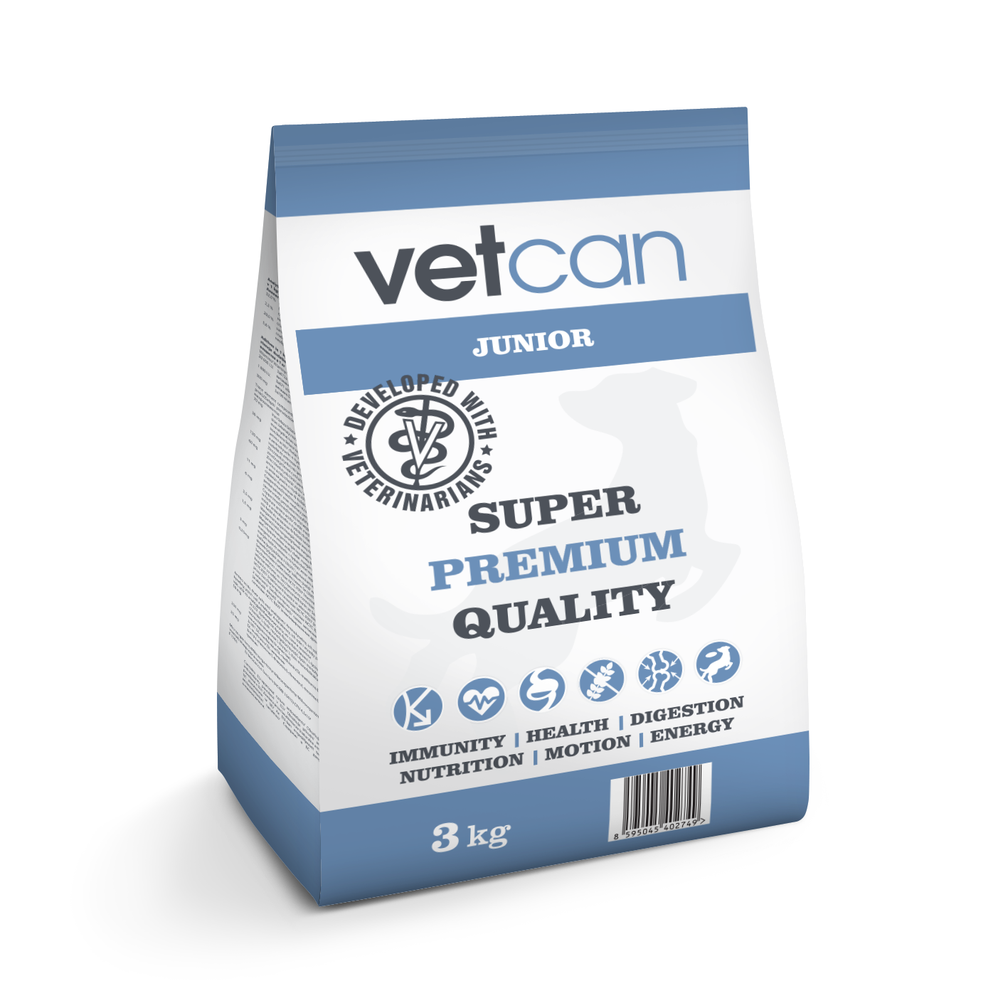 Vetcan Junior je plne vyvážené kompletné krmivo, špeciálne vyvinuté tak, aby vyhovovalo špecifickým potrebám šteniat a mladých psov. Je vyrobené z najkvalitnejších surovín dostupných na svetových trhoch. Kvalitné mäsové múčky (len rybia a hydinová – obsah 41 %) sú vynikajúcim zdrojom bielkovín. Doplnené esenciálne aminokyseliny dolaďujú pomer aminokyselín a umožňujú maximálnu stráviteľnosť a využiteľnosť bielkovín z krmiva, a tým zaručujú primeraný rast a rozvoj mladého organizmu. Obilniny a tuky poskytujú optimálnu hladinu energie. Antarktický krill (malé morské kôrovce), je zdrojom vysoko kvalitných bielkovín a tukov, ktoré sú bohaté na potrebné a životne dôležité Ω-3 polynenasýtené mastné kyseliny. Ďalej obsahuje najsilnejší prírodný antioxidant astaxanthín. Pridané doplnkové látky udržujú organizmus v požadovanej kondícii, zdravotnom stave a zabraňujú vzniku rastových problémov.